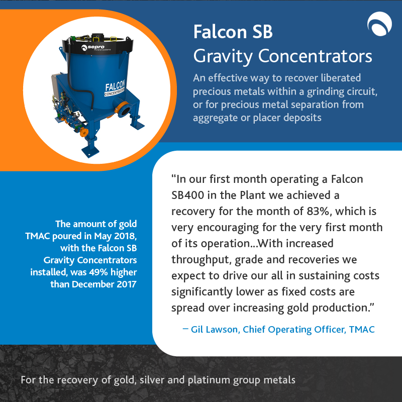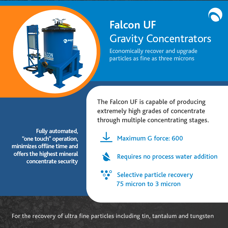 Right now, Sepro’s second generation Falcon centrifuges are in operation at sites across the world. Our Falcon Semi-Batch (SB) is ideal for gold, silver and platinum group metal recovery while the Falcon Continuous (C) is perfect for concentration of tin, tantalum, tungsten, chrome, cobalt, iron, fine oxidized coal and uranium. Finally, the Falcon Ultra-Fine (UF) is a prime piece of equipment for recovering particles finer than 45 microns.